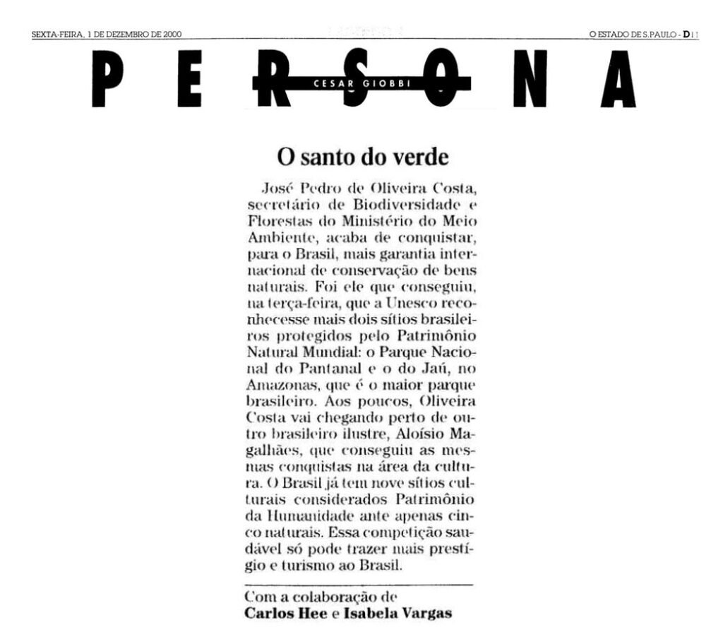 Matéria de 1º de dezembro de 2000 na coluna PERSONA de Cesar Giobbi para o jornal Estado de São Paulo. Colaboraram com a matéria Carlos Hee e Isabela Vargas.